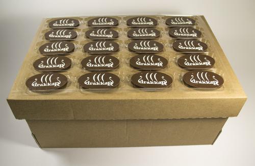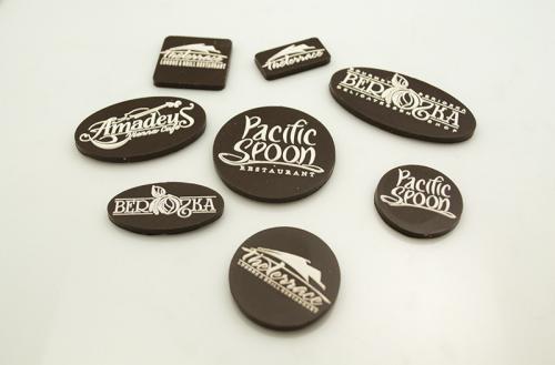 На сегодняшний день мы предлагаем шоколадные таблички ручной работы с индивидуальным логотипом для тортов. Минимальный тираж 500 штук.