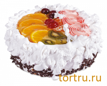 Состав: шоколадно-сметанный бисквит, воздушное безе, взбитые сливки, фруктовый наполнитель, свежие фрукты, желе, шоколадная крупка