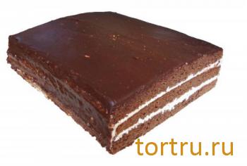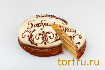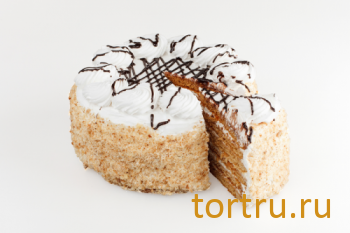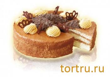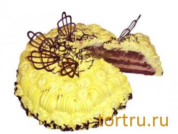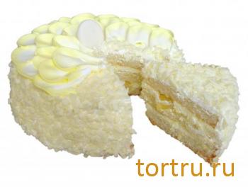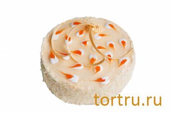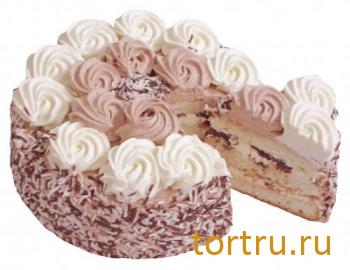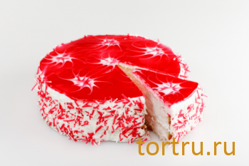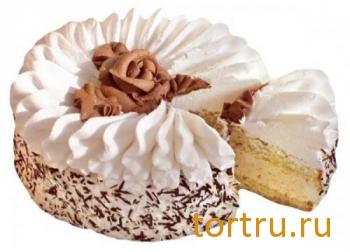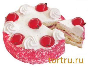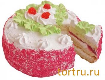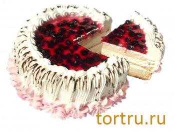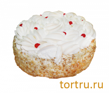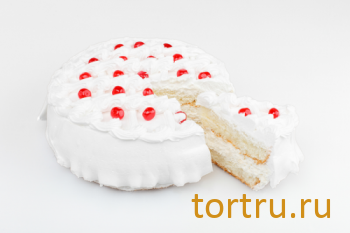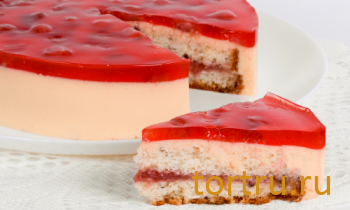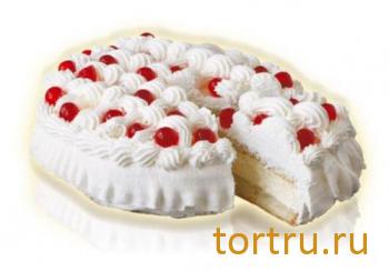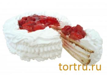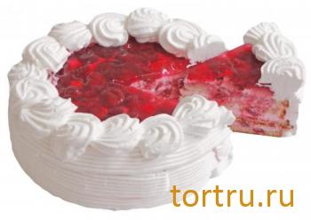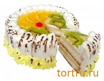 Четыре тонких слоя белого бисквита соединены нежным кремом "со сливками" с добавлением йогурта с фруктовым наполнителем "Злаки". Поверхность оформлена свежими фруктами и желе. Боковая поверхность торт формлена воздушным кремом "со сливками" и топингом шоколад.