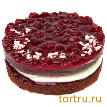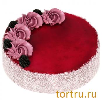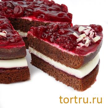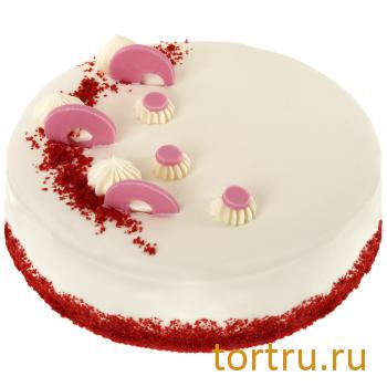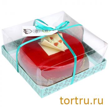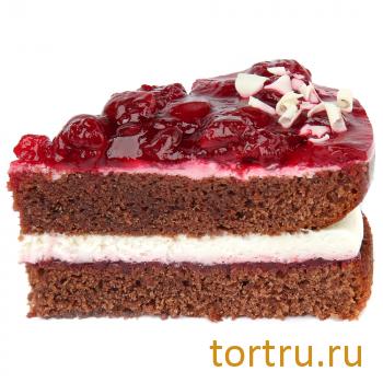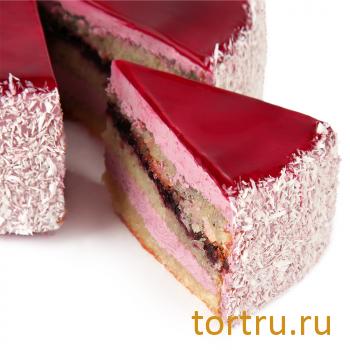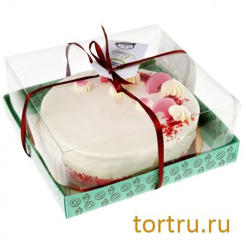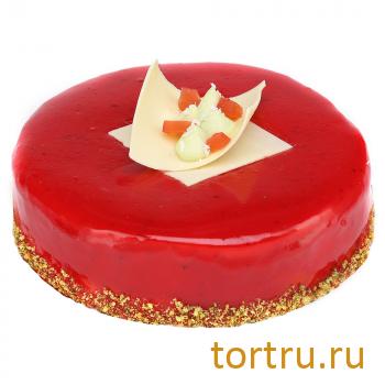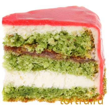 Изделие мучное кондитерское. Шпинатный бисквит зелёного цвета промазан лёгким творожно-сливочным кремом с прослойкой клубничного конфитюра, поверхность залита клубничной глазурью и украшена декором из белого шоколада.