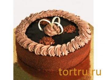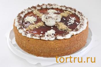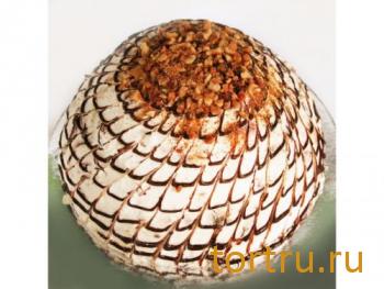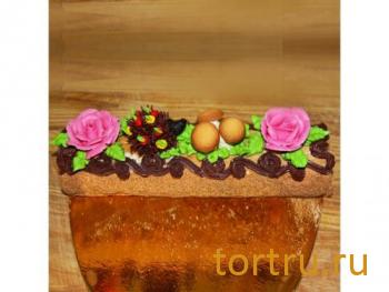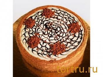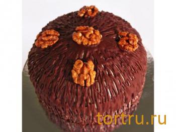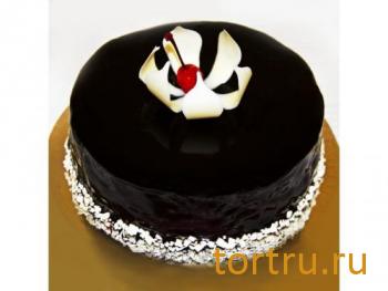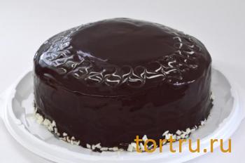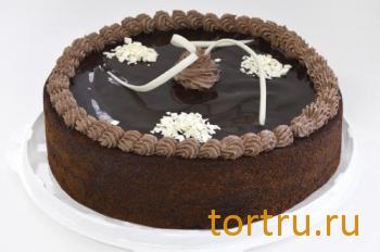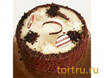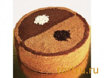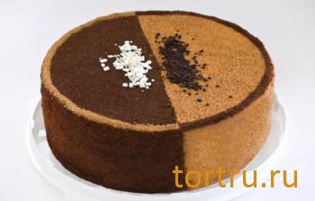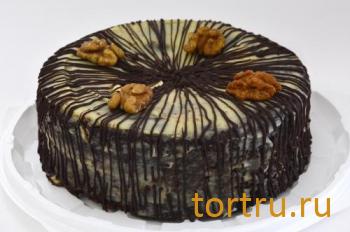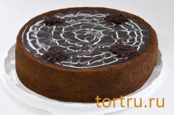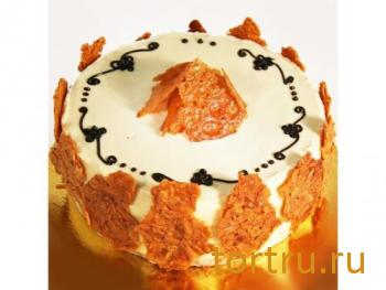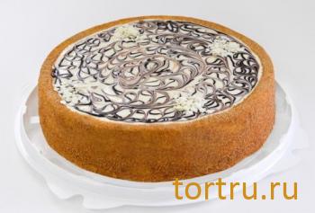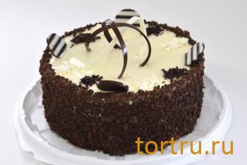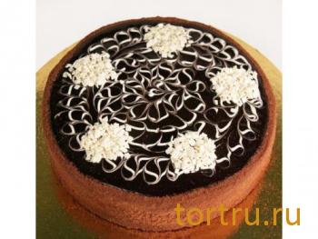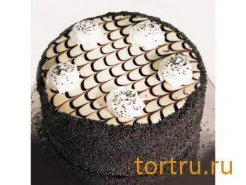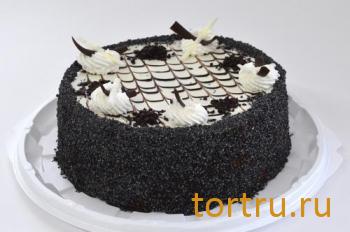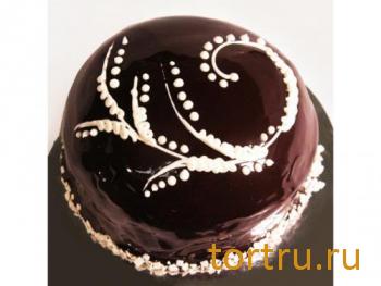 Темный бисквит с добавлением какао, сливочный крем, украшен белым и темным кондитерским гелем.