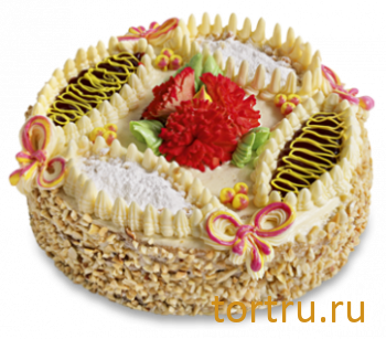 Слои бисквита, пропитанные сиропом, соединены шоколадным кремом,смешанным с дробленным арахисом,коньяком и фруктово-ягодной подваркой. Торт украшен сливочным кремом, орехами и гвоздикой из сахарной мастики.