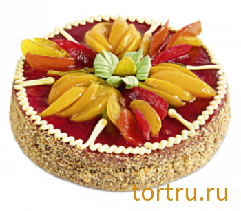 Слои бисквита, пропитанные сиропом, соединены шоколадным кремом и вареньем. Торт украшен зажелированными персиками и цукатами.