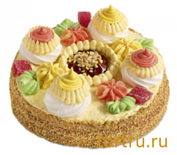 Основа из безе с орехами прослоена сливочным кремом. Торт украшен узором из сливочного и шоколадного крема и меренгами из безе.