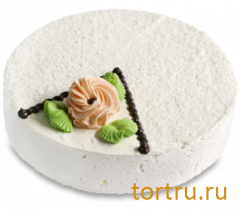 Бисквитные коржи соединены кремом “Суфле”. Торт украшен кокосовой стружкой и сливочным кремом.