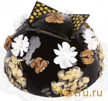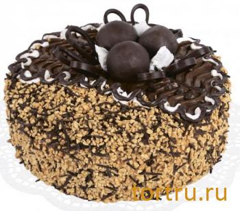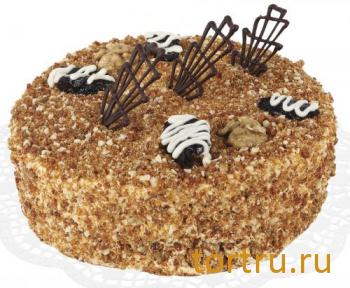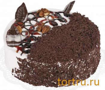 Описание: Слои традиционного бисквита, пропитанные сиропом, соединены сливками с добавлением шоколадно-ореховой пасты. Торт украшен ванильной и шоколадной глазурью, грецким орехом.