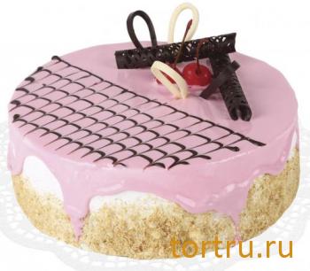 Описание: Слои бисквита пропитаны сиропом с добавление коньяка и соединены взбитыми сливками с йогуртовой массой. Торт украшен клубничным джемом и залит клубничной желейной глазурью.