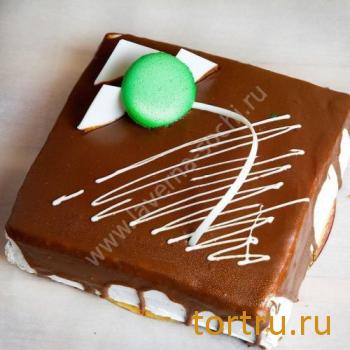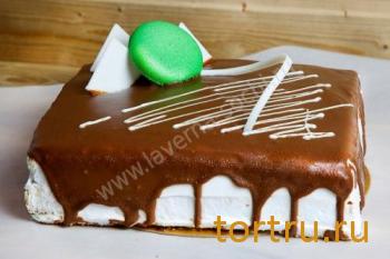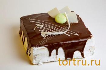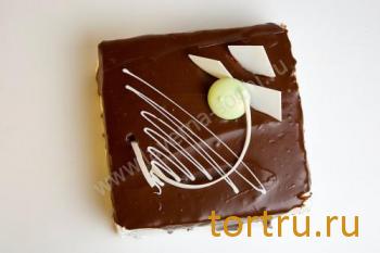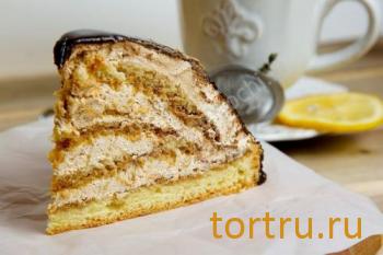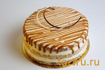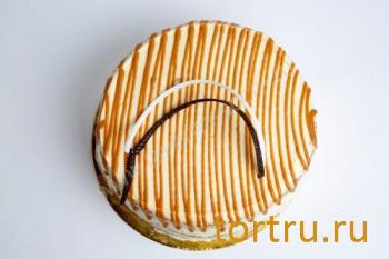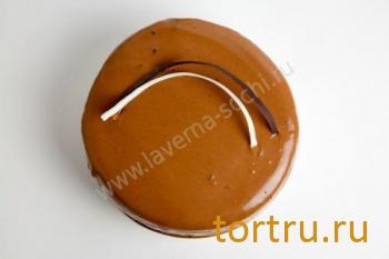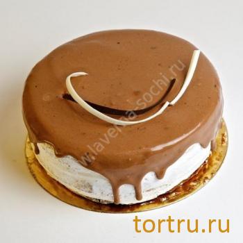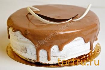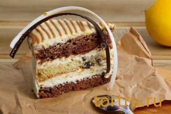 Состав: три коржа бело-коричневого бисквита (Зебра) промазаны ореховым Пралине и кремом из сбитых натуральных сливок и сливочного сыра «Маскарпоне». Поверхность залита шоколадным глясажем и украшена декором из белой и тёмной шоколадной глазури.