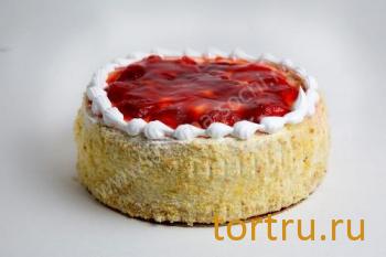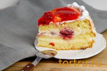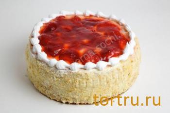 Состав: белый бисквит, заварной крем из натуральных сливок, клубника свежезамороженная внутри между слоями бисквита и сверху. Верхний слой клубники покрыт желе.