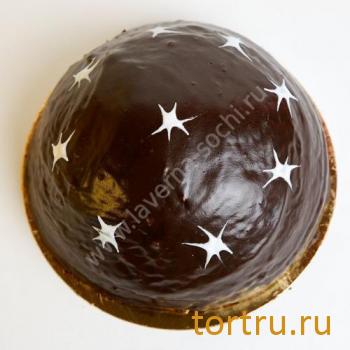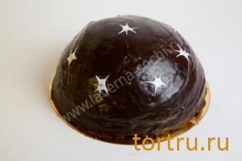 Собирается торт в виде горки из целого белого бисквита и маленьких бисквитиков «буше», которые хорошо пропитываются кофейно–коньячной пропиткой и промазываются кремом из сбитых сливок и варёной сгущёнки. Поверхность торта глазируется тёмным шоколадом, на котором белым декор–гелем рисуются звезды.