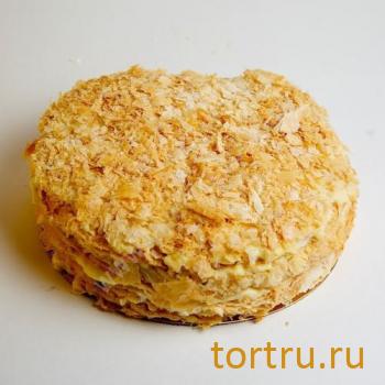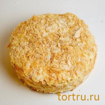 Пять коржей слоёного полуфабриката смазаны заварным кремом, который готовится на натуральных сливках 35 % жирности с добавлением сливочного масла, яичных желтков, сахарной пудры. Поверхность обсыпана крошкой этого же полуфабриката.