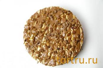 Медовые коржи, безе с орехом. Крем: взбитые сливки с вареной сгущенкой. Обсыпка с грецким орехом