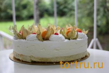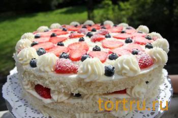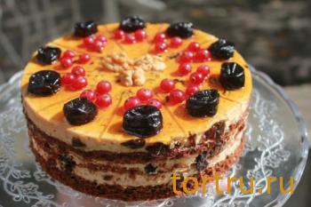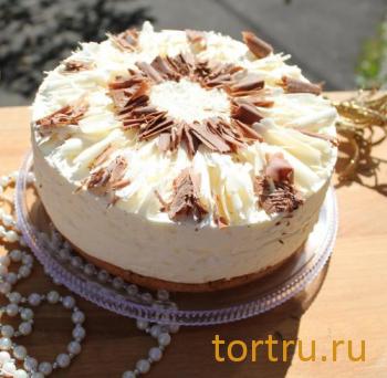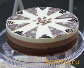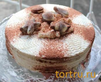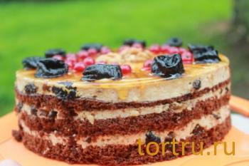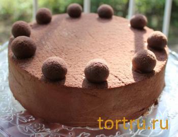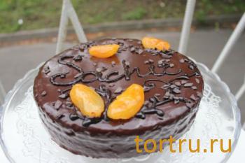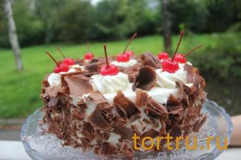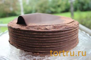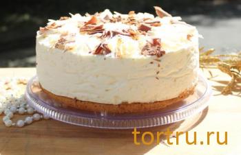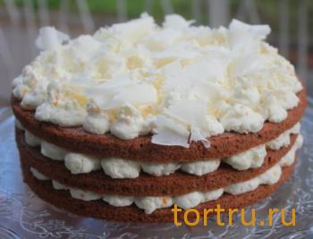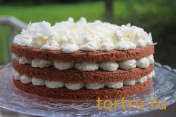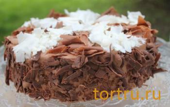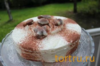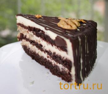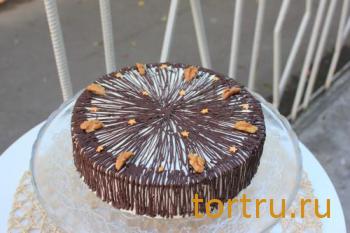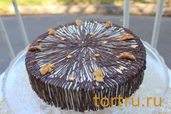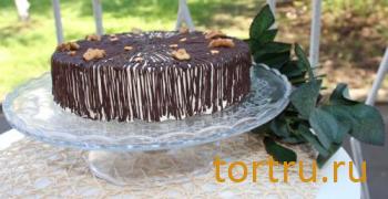 Шоколадный бисквит с кремом из белого шоколада, сметаны и грецких орехов, украшенный среднегорьким шоколадом и грецкими орехами.