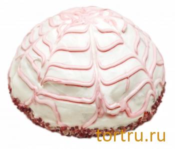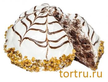 Нежный бисквит на сметане с добавлением какао, пропитанный взбитым сметанным кремом. Украшен грецким орехом и узором из шоколадной глазури.