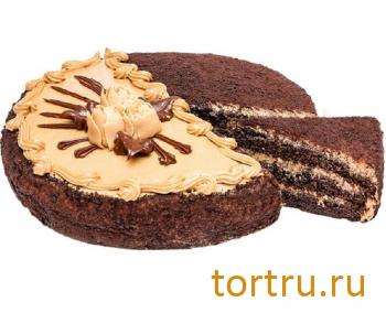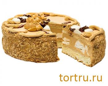 Масляные бисквиты, прослоенные карамельным соусом и заварным кремом. Поверхность торта украшена карамельным соусом.