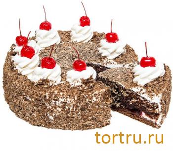 Легкий масляный бисквит с какао, пропитанный ароматным сиропом. Идеально сочетается с пикантной вишней в желе и взбитым сливочным кремом. Украшен шоколадной крошкой, взбитыми сливками и мараскиновой вишней.