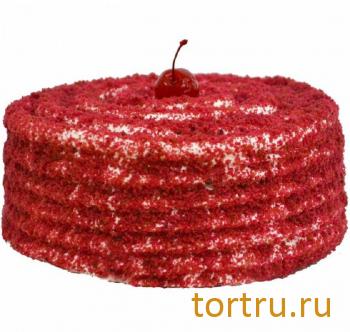 Три слоя алого бисквита с добавлением какао, прослоенные сливочным кремом с добавлением сыра Маскарпоне и желе из вишен.