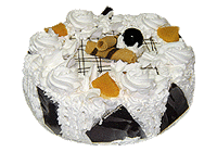 Украшение: Взбитые сливки, шоколадная глазурь, печенье и фрукты (преобладающий ананас).