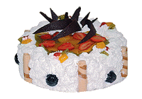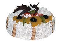 Украшение: Взбитые сливки, фигурный шоколад, фрукты и фигурки из мастики с жевательной.
