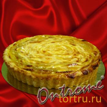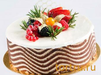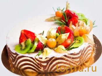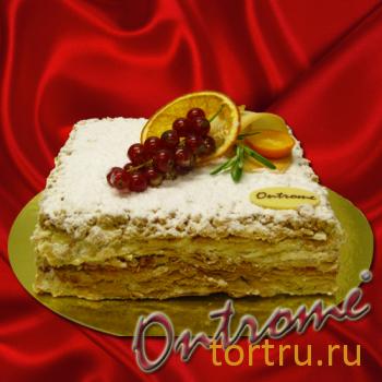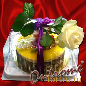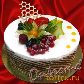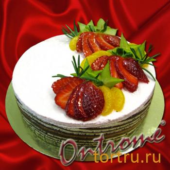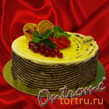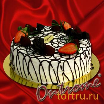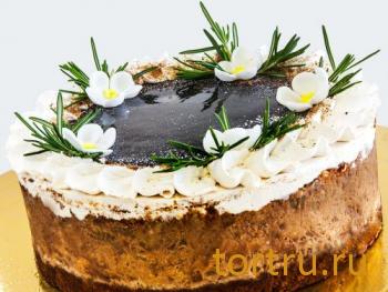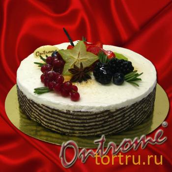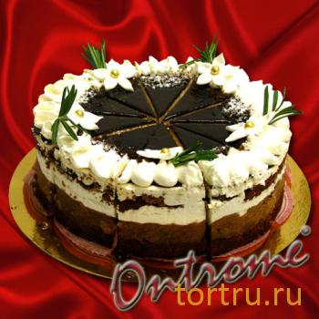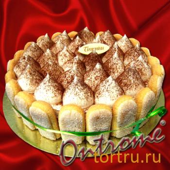 Нежный кремё из сливок и сыра "маскарпоне" на тонком французском бисквите, пропитанном ромовым сиропом, кофе и апельсиновым соком, боковая поверхность торта украшена печеньем "Савоярди".