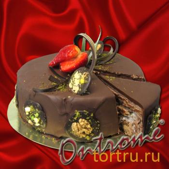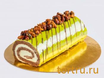 Ореховый кремё с фисташковыми орехами на тонком слое белого бисквита, торт покрыт шоколадным велюром.