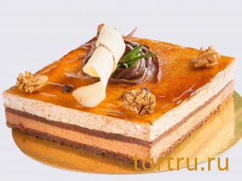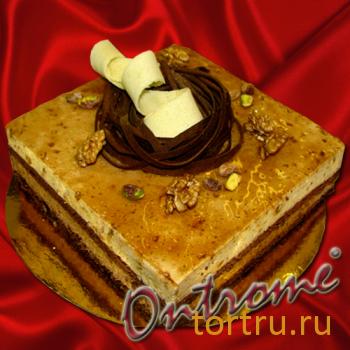 Кофейный и шоколадный кремё с грецкими орехами в карамели на тонком шоколадном бисквите, пропитанном легким сиропом.