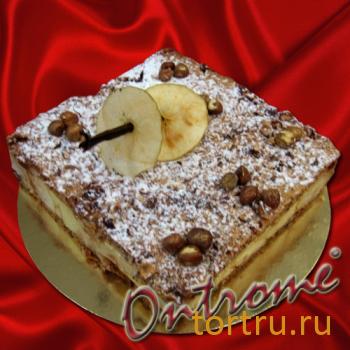 Белково-ореховый бисквит с лесными орехами с прослойкой из запеченных яблок с корицей, пропитанных коньяком на креме «патисье» .
