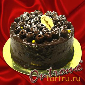 «Онтроме Велюр (черный)» - торт с муссом из темного шоколада с прослойкой воздушной меренги и чернослива на тонком шоколадном бисквите, пропитанном ромом, торт покрыт ганажем.