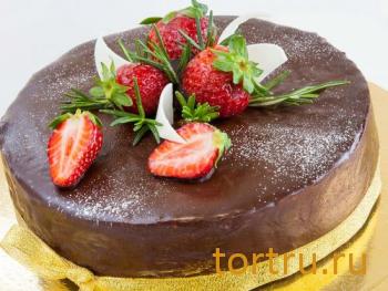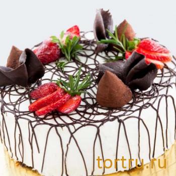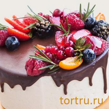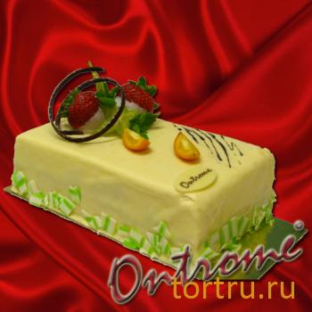 Кремё из белого шоколада со сливочным кремом с прослойкой клубничного конфитюра на тонком слое бисквита, покрыт шоколадом и украшен ягодной композицией.