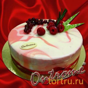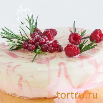 Сочетание малинового кремё с ягодами малины и белого шоколада на тонком французском бисквите, глазурованный белым кувертюром.