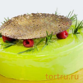 Ореховый кремё с фисташковыми орехами в токном слое шоколадного бисквита, глазированный фисташковым гелем.