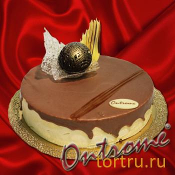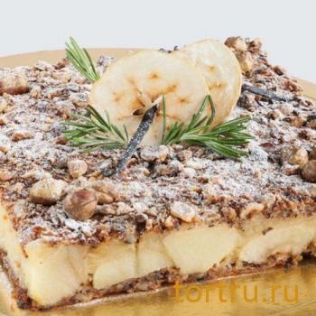 Шоколадный бисквит, пропитанный сиропом, с прослойкой сливочно-карамельного кремё, банана и молочного шоколада.