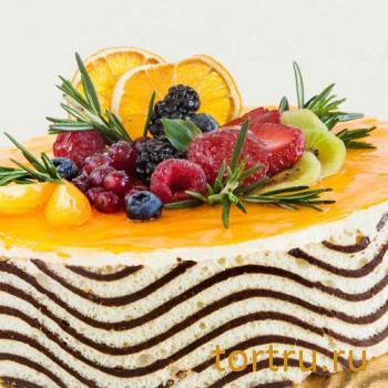 Мандариново-шоколадный кремё с дольками мандарина на тонком шоколадном бисквите, пропитанном легким сиропом, украшен ягодами и фруктами в ассортименте, боковая поверхность торта в миндальных лепестках.