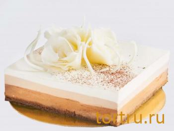 Крем из белого, молочного и черного шоколада на тонком шоколадном бисквите, пропитанный сиропом – просто тает во рту.