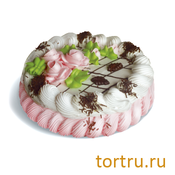 Описание: Белые бисквиты прослоены клубничной начинкой и кремом из взбитых сливок. Бока оформлены взбитыми сливками. Торт украшен сливковым кремом и шоколадной глазурью.