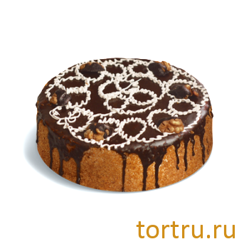 Описание: Два слоя бисквита пропитаны медовым сиропом и прослоены сливочным кремом с вареной сгущенкой. Сверху торт полит шоколадной глазурью и оформлен грецкими орехами.