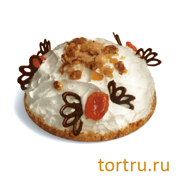 Описание: Кусочки белого и шоколадного бисквита перемешаны со сметанным кремом, курагой и грецкими орехами и сформированы в виде полусферы. Поверхность торта покрыта также сметанным кремом и оформлена курагой, грецкими орехами и шоколадной глазурью.