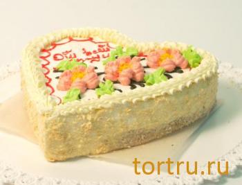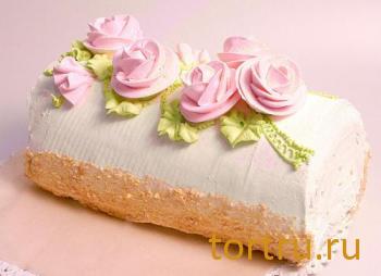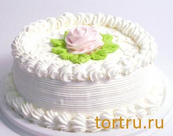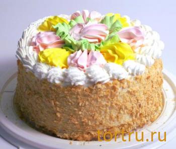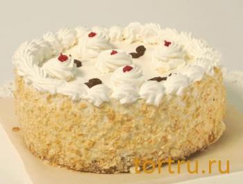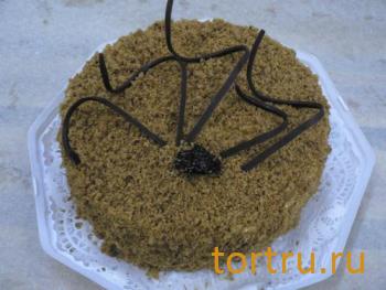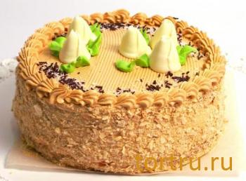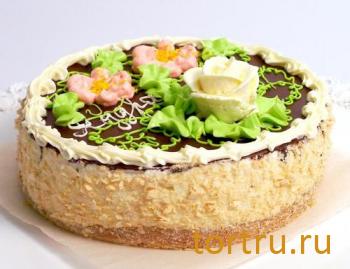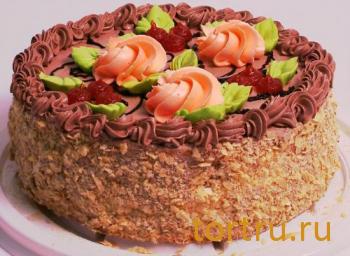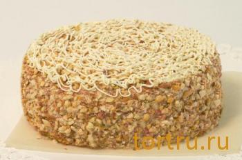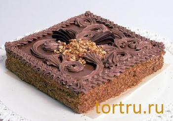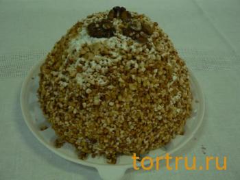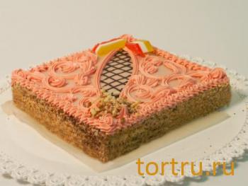 Два слоя песочного полуфабриката соединены сливочным кремом. Боковая часть обмазана этим же кремом и обсыпана бисквитной крошкой. Поверхность торта залита помадкой, отделена сливочным кремом, украшена цукатами и орехами.