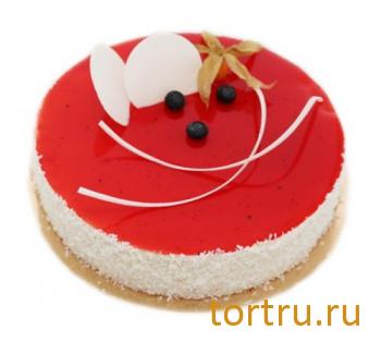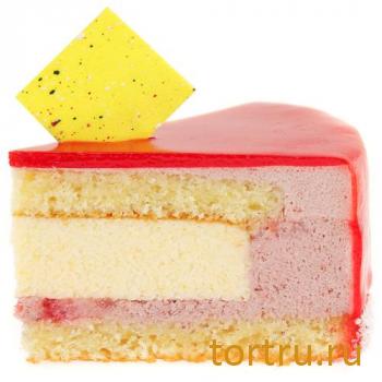 Состав: меланж, мука, белок, пюре апельсин, вода, малиновое пюре, клубничное пюре, желатин, пюре абрикос, сахар, сливки, клубника, гель зеркальный клубничный, соль, разрыхлитель.