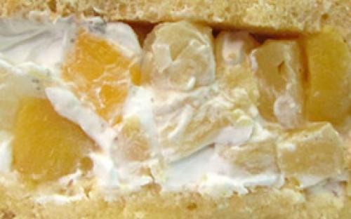 • Сметанная. Нежный ванильный бисквит, пропитанный сиропом с добавлением коньяка, прослоенный сметаной со сливками, с добавлением ананаса и персика или клубники и вишни.