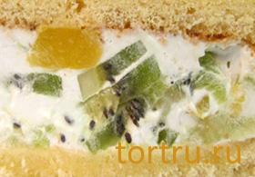 • Йогуртовая. Нежный ванильный бисквит, пропитанный сиропом с добавлением коньяка, прослоенный сливками и йогуртом, с добавлением киви и ананаса (или персика) или клубники и вишни.