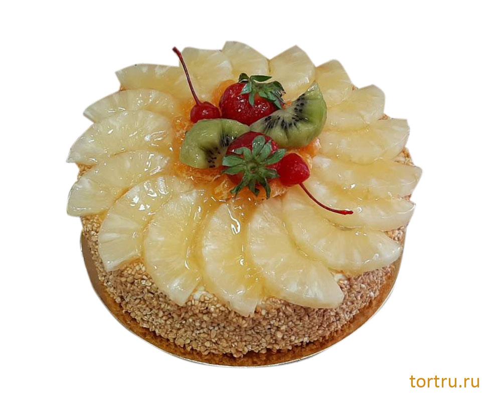 Тонкие ванильные коржи, пропитанные апельсиновым джемом в сочетании со сливочно-заварным кремом. Украшен свежими фруктами (мандаринами, киви, клубникой и коктейльной вишней)