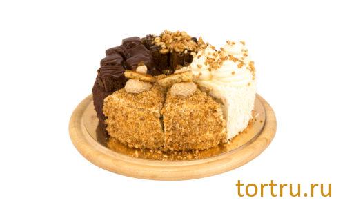 Это порционный торт, который состоит из кусочков уже представленных Вам ранее в этой серии тортов: «Карамельный Джаз», «Медовый», «Шоколадное танго», «Птичье молоко».
