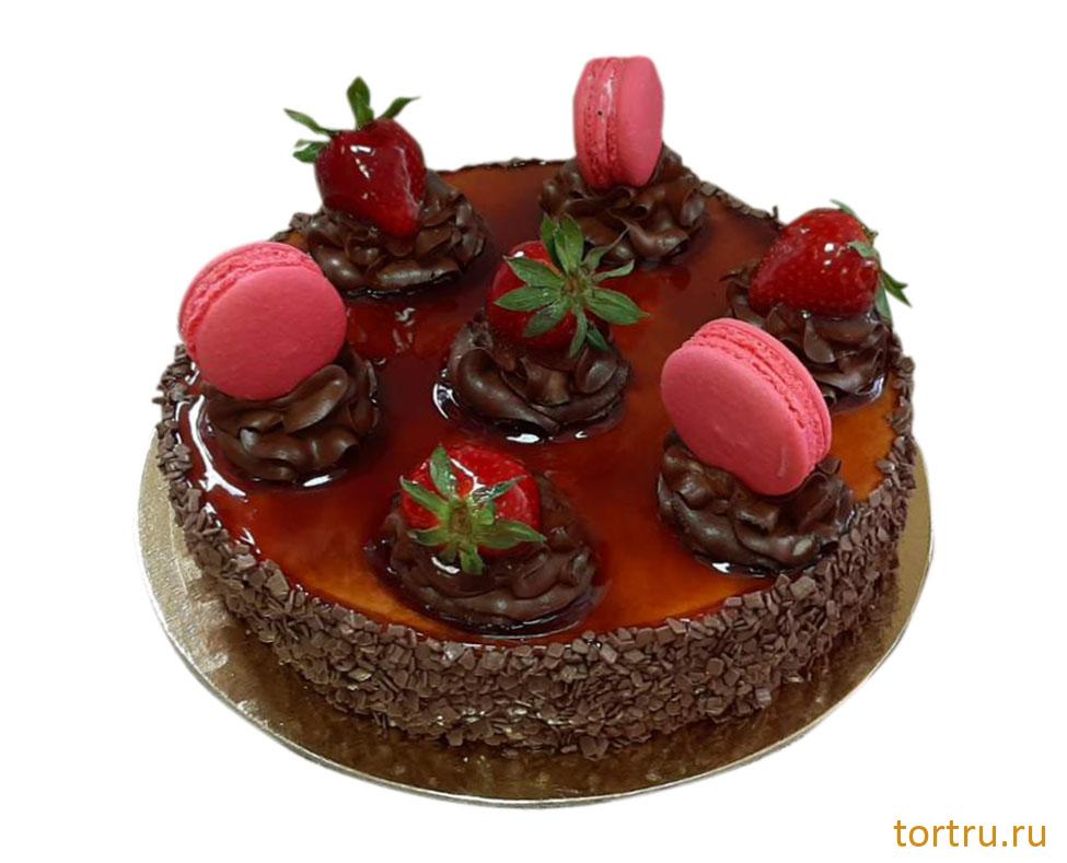 Кремчиз с прослойкой карамели в сочетании с ванильным бисквитом. Украшен шоколадной крошкой, свежей клубникой и клубничными макаронсами.