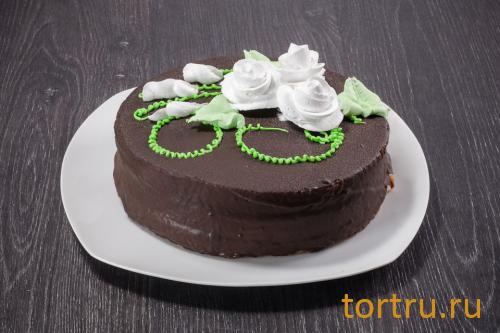 Торт - напоминание о прекрасном отдыхе и жарком лете. Шелковистый бархат напоминает шоколадная глазурь, создающая удачный контраст с букетом белоснежных роз на торте. А изысканный вкус определяют нежный бисквит, фруктовое повидло и легкие воздушные сливки.