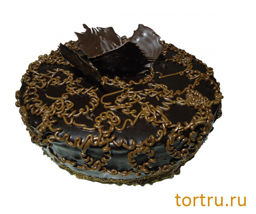 Белый нежный бисквит, пропитанный сахарно-коньячным сиропом, прослоен шоколадной начинкой, кофейным суфле и украшен шоколадным ганашем и узорами из шоколада.