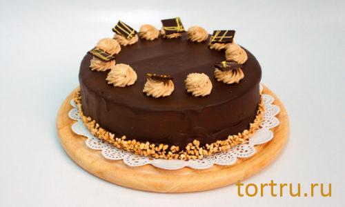 Карамельный бисквит пропитан молочным шоколадом, склеен сливочным кремом с вареным сгущённым молоком, обмазан шоколадными сливками и полит ганашом.