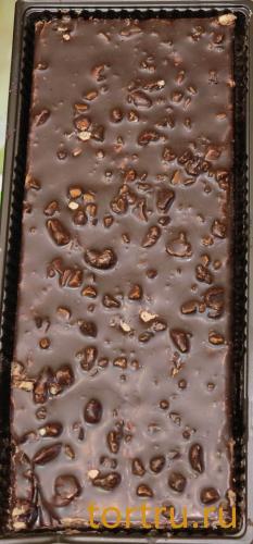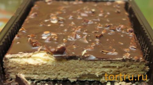 Торт был куплен за 45р. Вкуса орехов почти не чувствуется, шоколада сверху торта совсем тонкий слой, по бокам шоколада почти нет, а внизу совсем нет шоколада, да и не шоколад это, а заменитель. Но в целом всё вместе получается вкусно, хотя если сравнивать с более дорогими аналогами, то торт не очень. Но для такой цены вполне вкусный и съедобный.