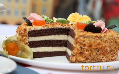 Бисквит с како, крем сливочный «Чешский», грильяжная крошка, цукаты, шоколадная глазурь.