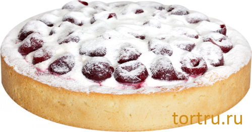 Песочный корж с бортами, наполненный легкий сметанным кремом и свежей вишней. Посыпан сахарной пудрой.